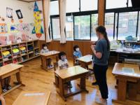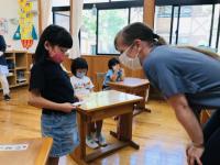 先日から練習している「何が好きですか?」を、今日は先生方に尋ねていきます。質問やあいさつの仕方を練習をして、思い思いに活動が始まりました。